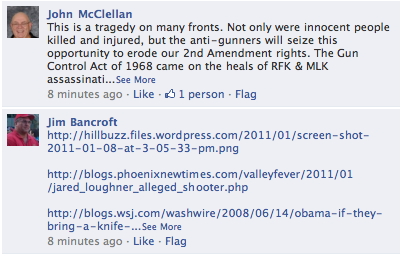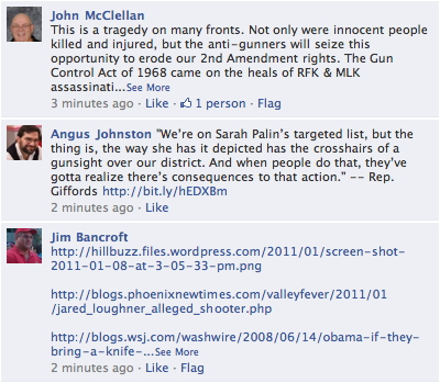 The comment thread from Sarah Palin’s Facebook post on yesterday’s Tucson shooting, as it looked this morning at 8:35 am: