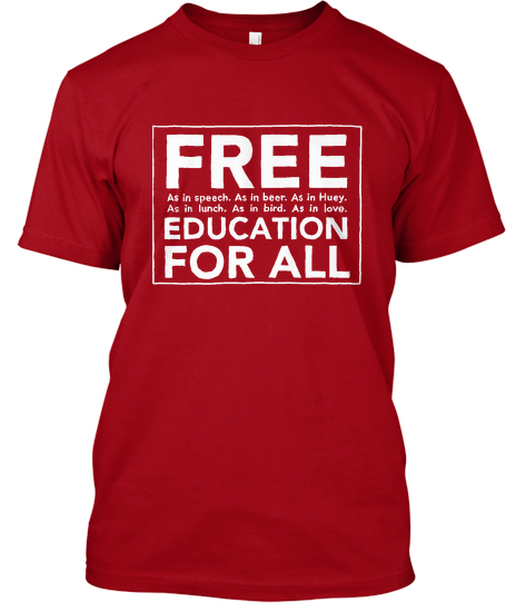 I’d like to say a little more about what I meant last week when I advocated for free public higher education, and I’d like to say it in the form of a series of annotations to a joke tee shirt.