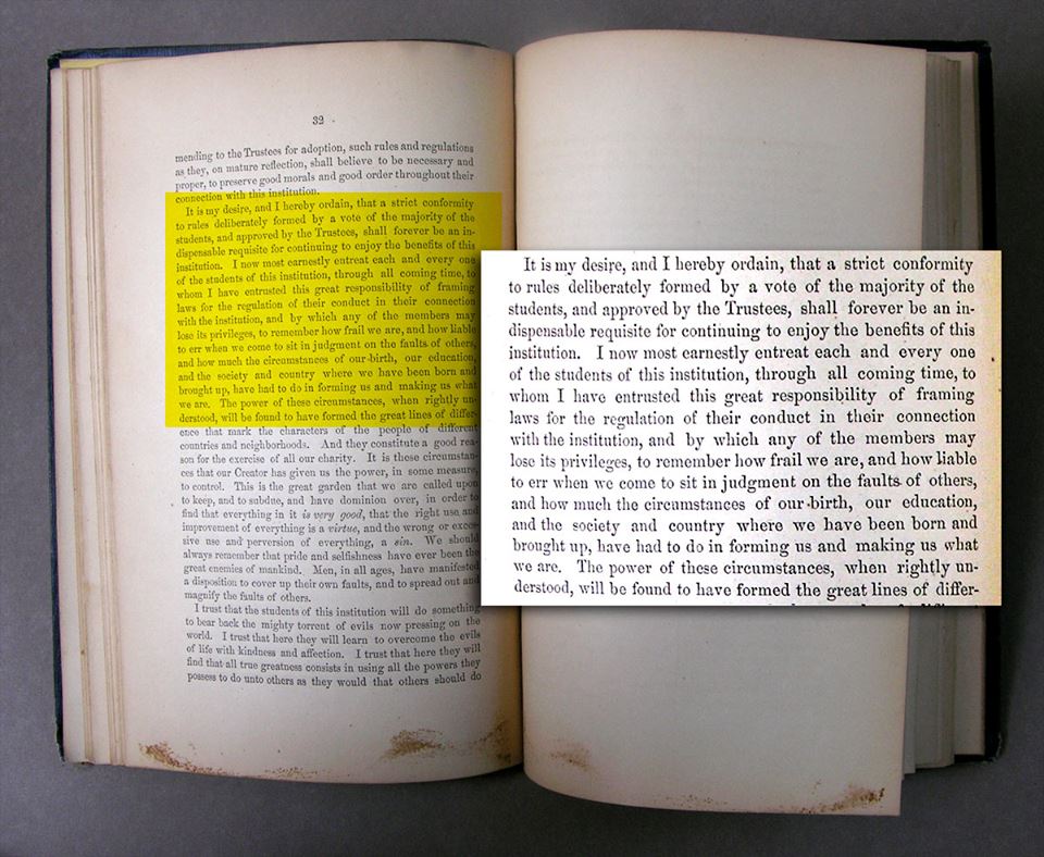 “It is my desire, and I hereby ordain, that a strict conformity to rules deliberately formed by a vote of the majority of the students, and approved by the Trustees, shall forever be an indispensable requisite for continuing to enjoy the benefits of this institution. I now most earnestly entreat each and every one of the students of this institution, through all coming time, to whom I have entrusted this great responsibility of framing laws for the regulation of their conduct in their connection with the institution, and by which any of the members may lose its privileges, to remember how frail we are, and how liable to err when we come to sit in judgment on the faults of others, and how much the circumstances of our birth, our education, and the society and country where we have been born and brought up, have had to do in forming us and making us what we are. The power of these circumstances, when rightly understood, will be found to have formed the great lines of difference that mark the characters of the people of different countries and neighborhoods. And they constitute a good reason for the exercise of all our charity. …